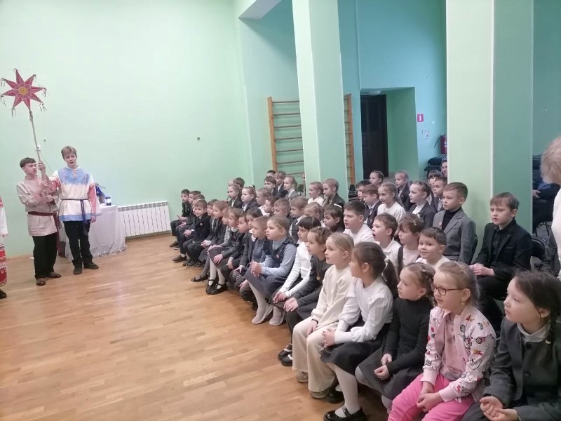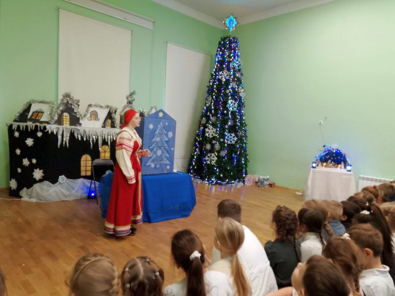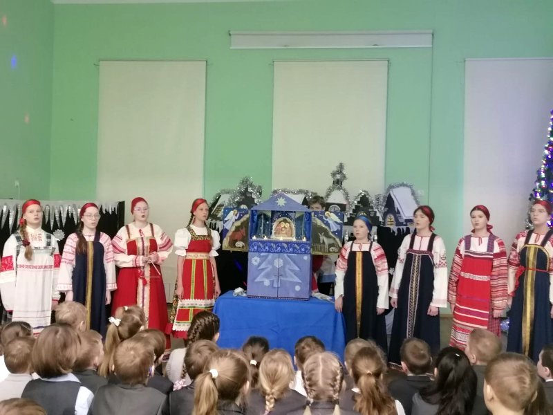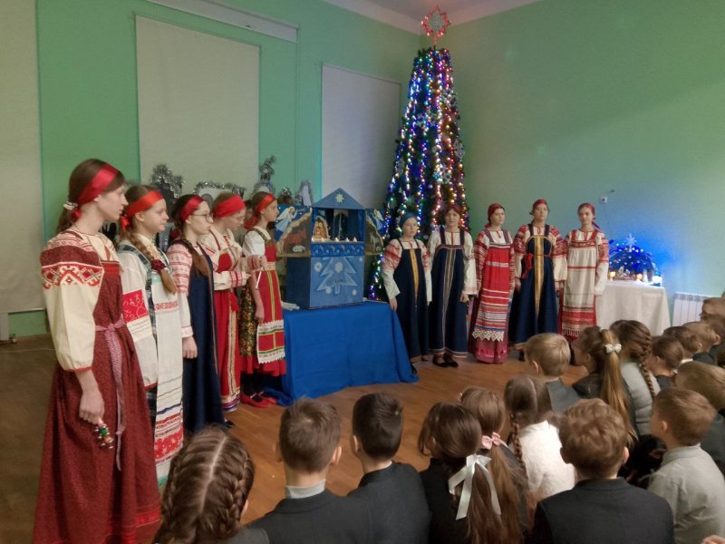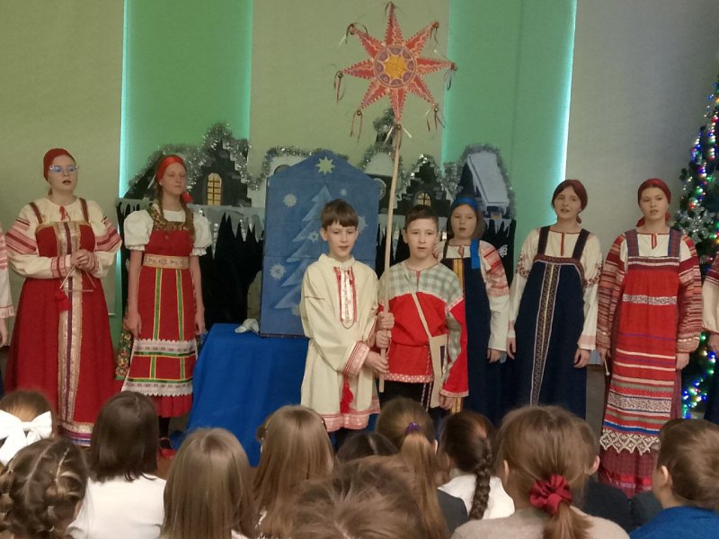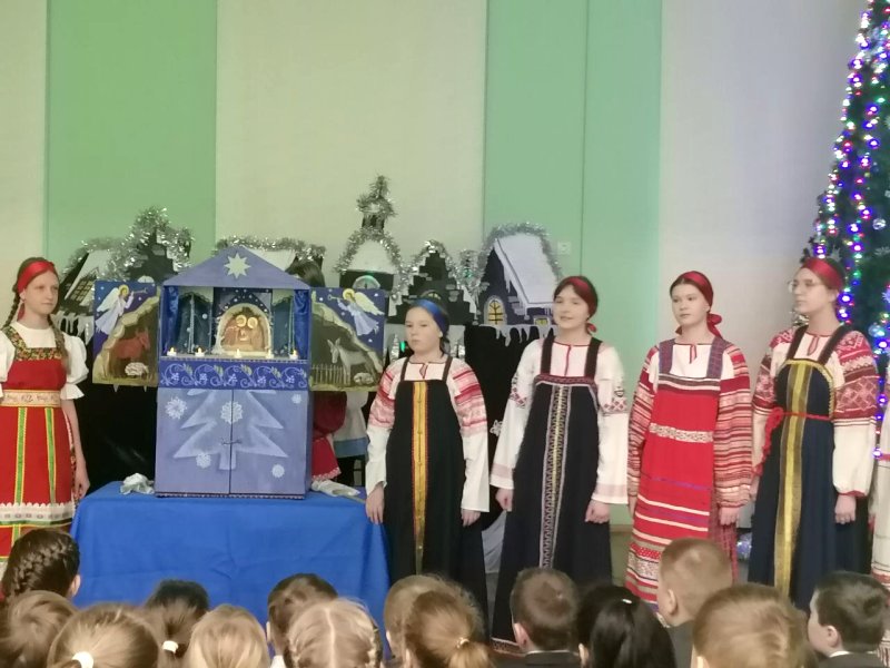 Коллектив вертепного театра «Старый город» (художественный руководитель Космынина Ирина Валерьевна) порадовал учеников начальной школы, показал евангельскую историю «Смерть царя Ирода», ученики в русских народных костюмах исполнили колядки, поиграли с детьми в русские народные игры.