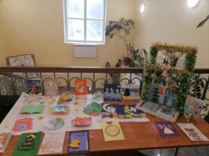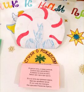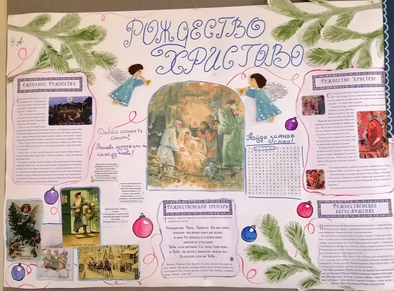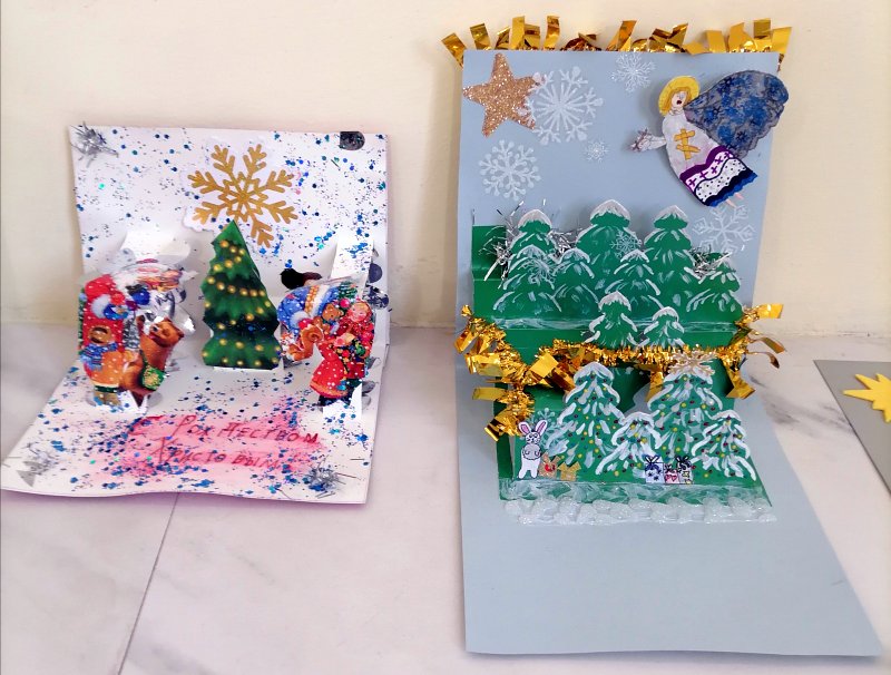 В преддверии праздника в начальной школе прошли занятия по изготовлению из картона, бумаги, ниток, бисера и другого материала рождественских игрушек, открыток, плакатов и газет. Творческие работы выполнены в разной технике и стиле, в различных видах декоративно-прикладного искусства. Многие работы гимназисты изготавливали дома в кругу семьи. Рождественские газеты делали в классе с учителями и воспитателями. Все работы были представлены на выставке в гимназии.
