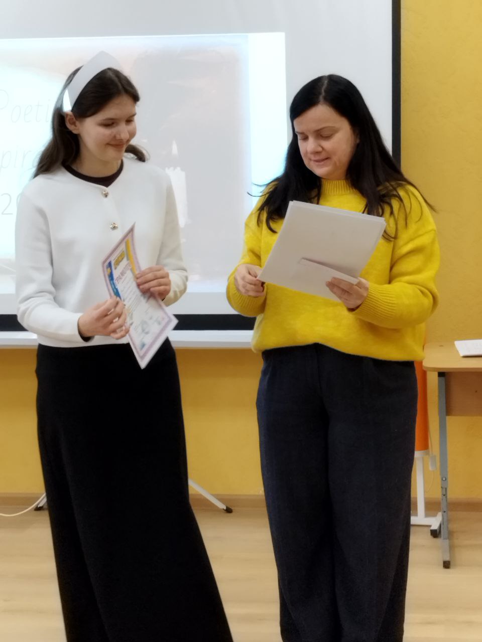 Приятно было видеть, как оживали строки поэтических произведений, и слушать, как участники наполняли их смыслом и эмоциями. Каждое выступление было уникальным, искренним и вдохновляющим. Учащиеся Православной гимназии Анастасия Фролова (10 класс) и Антон Быстров (7 А класс) тоже не остались в стороне и показали свои таланты чтецов английской поэзии. По результатам конкурса Анастасия заняла 3 место.