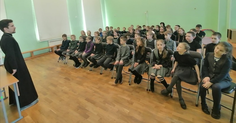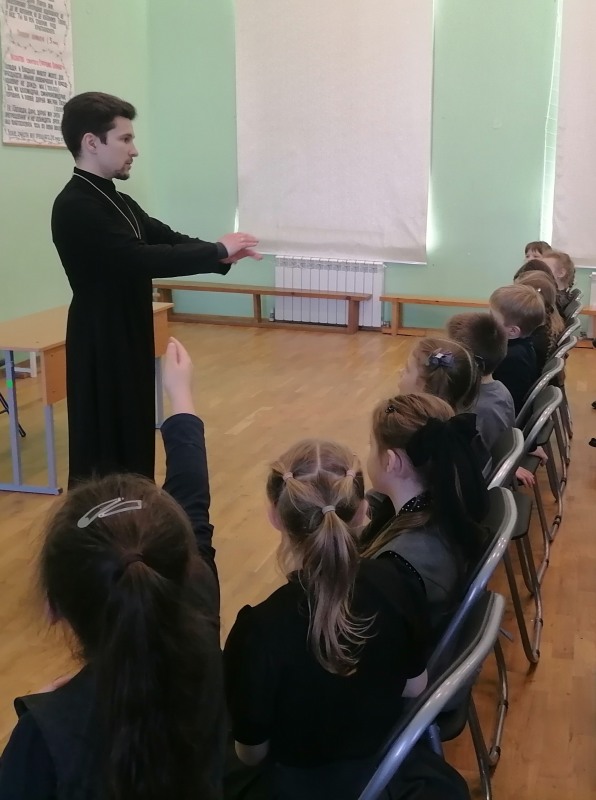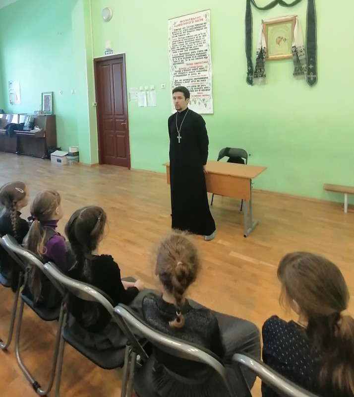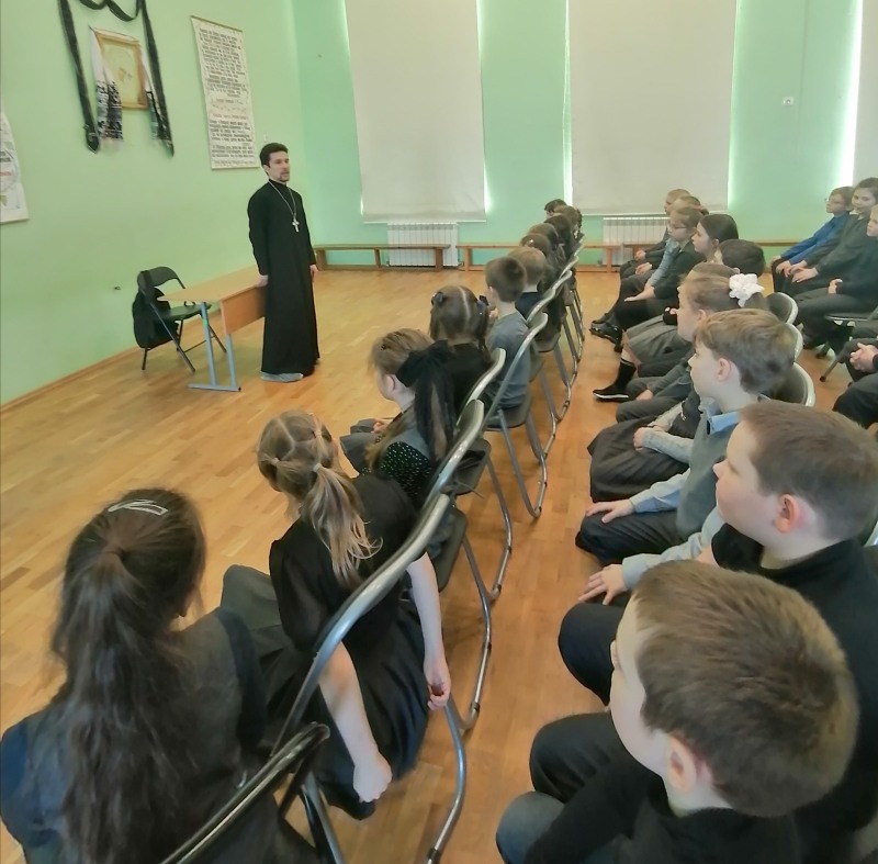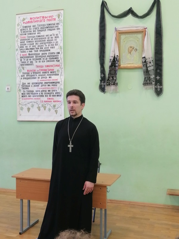 Максим Николаевич провёл духовно-просветительскую беседу с учениками о Великом посте. В ходе беседы священник рассказал детям о вере, молитвах и о традициях в жизни православных христиан во время Великого поста.