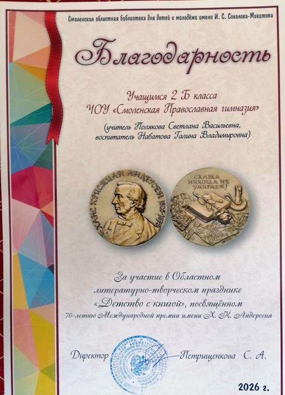 1 апреля гимназисты 2-х классов (учителя — Пономарева Г.Н., Полякова С.В., воспитатели — Владимирова Н.М., Набатова Г.В.) посетили Смоленскую областную библиотеку для детей и молодежи имени И.С.Соколова — Микитова, библиотека собрала друзей на литературный праздник, который совпал с днём рождения великого сказочника Ханса Кристиана Андерсена.