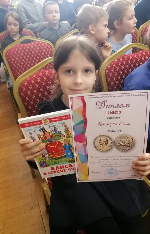 В торжественной обстановке юным читателям были вручены заслуженные награды за призовые места в номинациях «Золотые имена детской литературы» и «В стране героев Ханса Кристиана Андерсена». Пономарева Есения ученица 2 «А» класса заняла 3 место в номинации «В стране героев Г.Х. Андерсена», учителям вручили благодарности.
